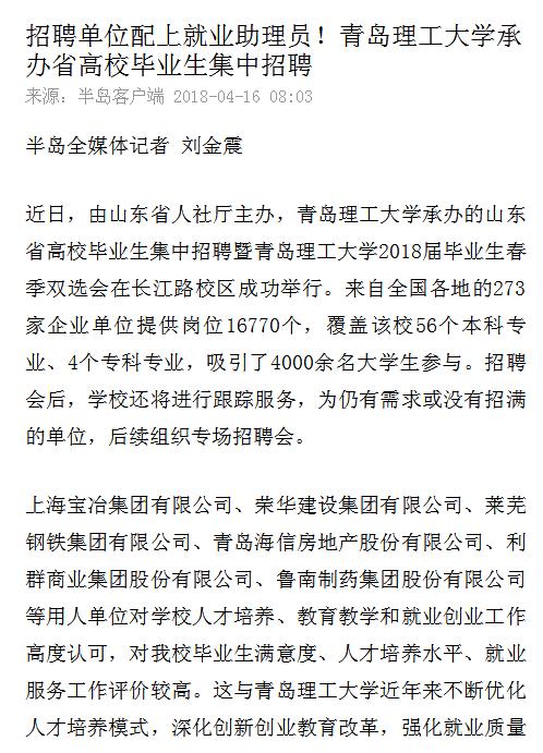 近日,由山东省人社厅主办,365完美体育承办的山东省高校毕业生集中招聘暨365完美体育2018届毕业生春季双选会在长江路校区成功举行。来自全国各地的273家企业单位提供岗位16770个,覆盖该校56个本科专业、4个专科专业,吸引了4000余名大学生参与。招聘会后,学校还将进行跟踪服务,为仍有需求或没有招满的单位,后续组织专场招聘会。