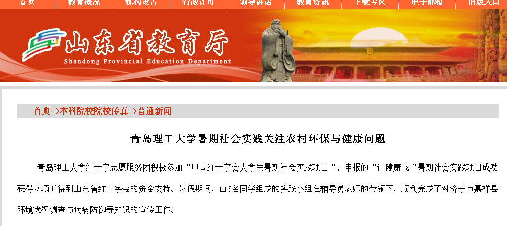 365完美体育红十字志愿服务团积极参加“中国红十字会大学生暑期社会实践项目”,申报的“让健康飞”暑期社会实践项目成功获得立项并得到山东省红十字会的资金支持。暑假期间,由6名同学组成的实践小组在辅导员老师的带领下,顺利完成了对济宁市嘉祥县环境状况调查与疾病防御等知识的宣传工作。