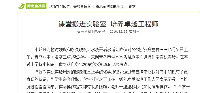 水垢分为暂时硬度和永久硬度,水烧开后水垢会降低到200毫克/升左右……12月24日上午,青岛17中37名高二卓越班学生,来到青岛市供水水质监测中心进行化学实践实验。在实践中了解水知识,做到从自身出发保护水资源减少水污染。