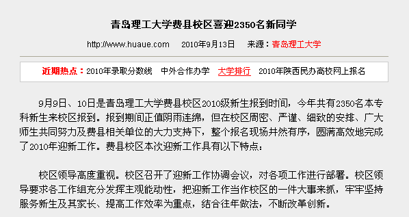 在校区广大师生积极努力及费县相关单位的协调配合下,全体迎新工作人员高度负责、认真工作、热情服务,确保了2010年迎新各项工作的顺利进行,实现了“安全、热情、高效”的总体要求。