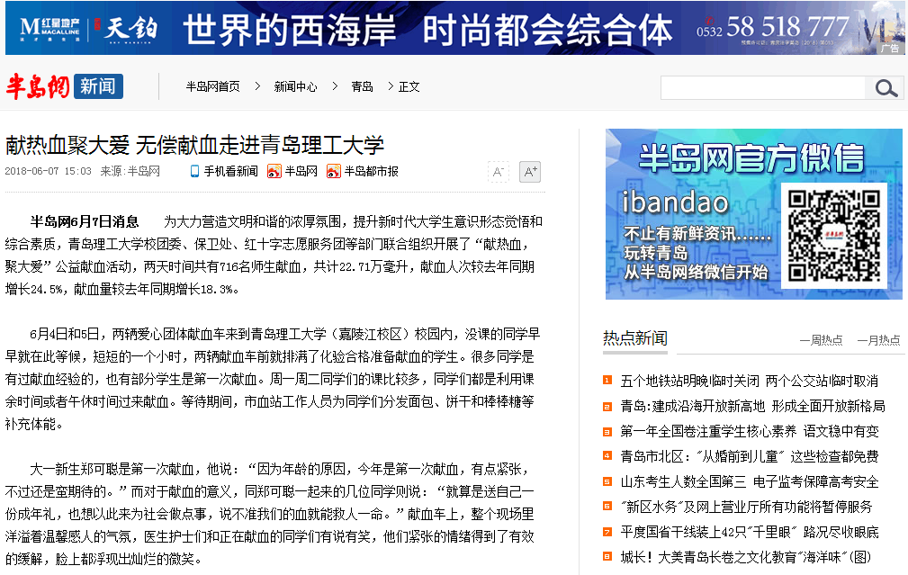 半岛网6月7日消息 为大力营造文明和谐的浓厚氛围,提升新时代大学生意识形态觉悟和综合素质,365完美体育校团委、保卫处、红十字志愿服务团等部门联合组织开展了“献热血,聚大爱”公益献血活动,两天时间共有716名师生献血,共计22.71万毫升,献血人次较去年同期增长24.5%,献血量较去年同期增长18.3%。