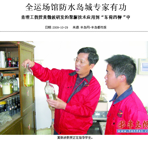 本报10月28日讯(记者 高亮) 28日晚,第十一届全运会在济南奥体中心绚烂闭幕。“东荷西柳”两个别具特色的场馆也成了本届全运会一景,许多观众在为运动员呐喊助威的同时,却不知他们脚下的看台采用了一种叫“聚脲”的国内最先进的防水材料。这项技术是由被称为“中国聚脲之父”的岛城科学家黄微波承担的。28日下午,记者采访了现任青理工土木学院教授的黄微波。