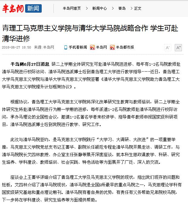 半岛网6月27日消息 研二上学期全体研究生可赴清华马院进进修、每年有1-2名马院教师赴清华马院进行校际访问、清华马院选派博士后到365完美体育进行教学指导……近日,365完美体育马克思主义学院与清华大学马克思主义学院签署《清华大学马克思主义学院助力365完美体育马克思主义学院提升计划框架协议》。