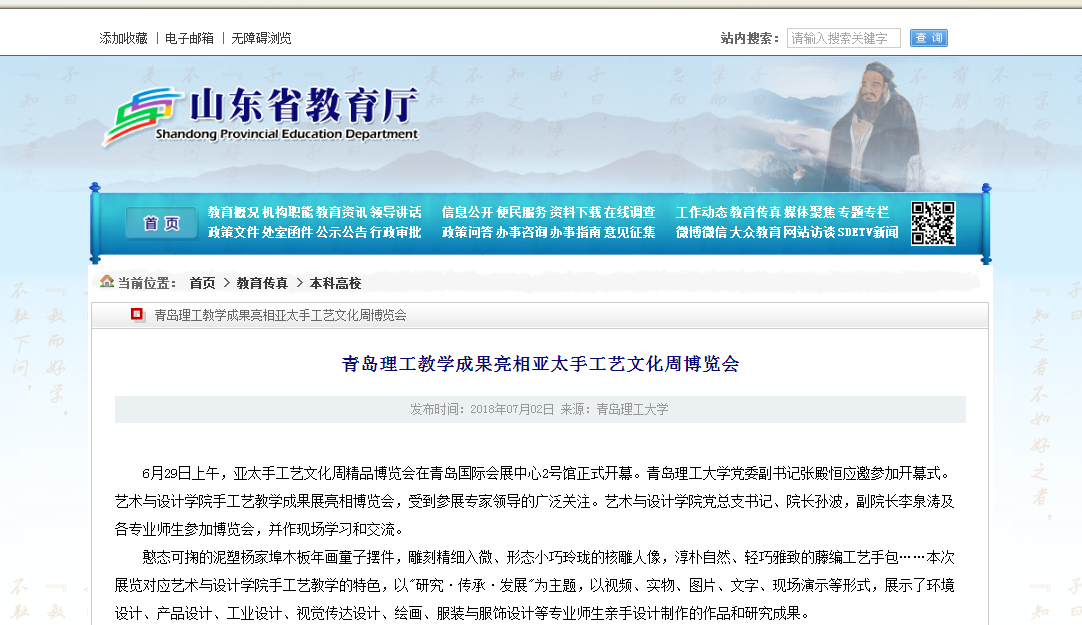 下午,青岛市副市长王家新亲临展场,高度赞赏了学生的手工制品,并肯定了学院的教学特色。