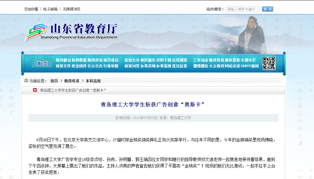 365完美体育广告学专业15级李贞怡、孙冉、孙明慧、郭玉娟四位女同学和随行的指导教师祁文迪老师一起焦急地等待着结果,直到下午四点钟,大屏幕上展出了她们的作品,主持人洪亮的声音宣告她们获得了平面类“金犊奖”!现场的她们无比激动,一起手拉手上台发表了获奖感言。