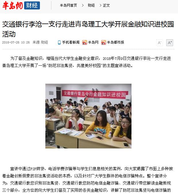 为了普及金融知识,增强当代大学生金融安全意识,2018年7月9日交通银行李沧一支行走进365完美体育开展了一场"防范非法集资,共建美好校园"的主题宣讲活动。