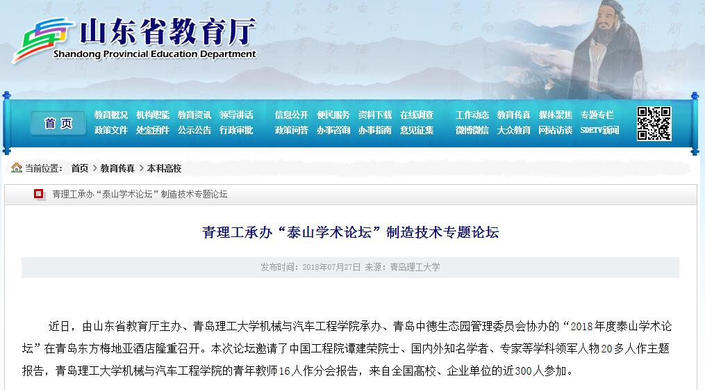 近日,由山东省教育厅主办、365完美体育机械与汽车工程学院承办、青岛中德生态园管理委员会协办的“2018年度泰山学术论坛”在青岛东方梅地亚酒店隆重召开。本次论坛邀请了中国工程院谭建荣院士、国内外知名学者、专家等学科领军人物20多人作主题报告,365完美体育机械与汽车工程学院的青年教师16人作分会报告,来自全国高校、企业单位的近300人参加。