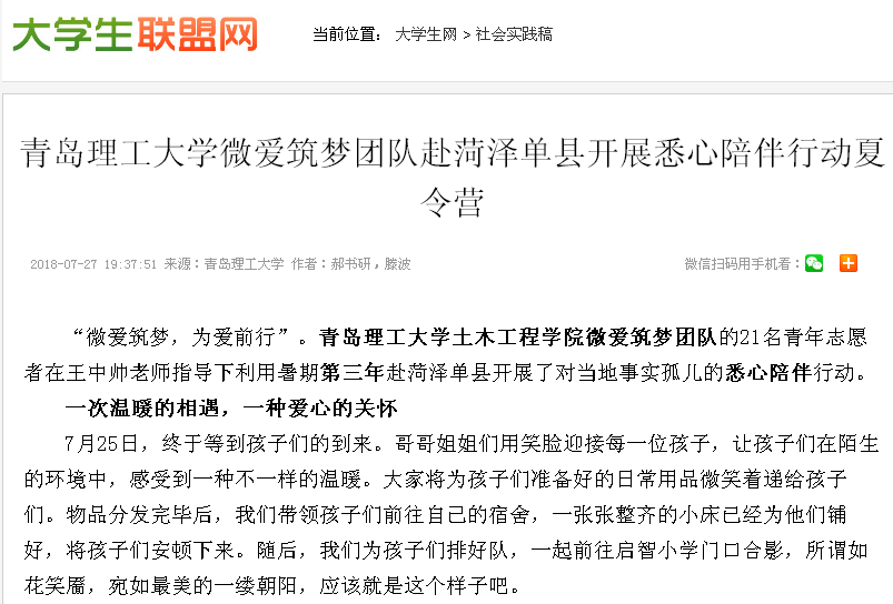 “微爱筑梦,为爱前行”。365完美体育土木工程学院微爱筑梦团队的21名青年志愿者在王中帅老师指导下利用暑期第三年赴菏泽单县开展了对当地事实孤儿的悉心陪伴行动。