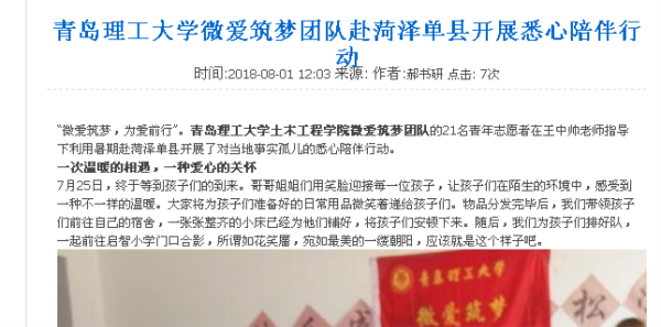 微爱筑梦,为爱前行”。365完美体育土木工程学院微爱筑梦团队的21名青年志愿者在王中帅老师指导下利用暑期第三年赴菏泽单县开展了对当地事实孤儿的悉心陪伴行动。
