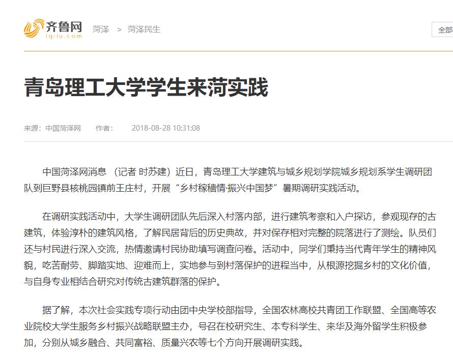 中国菏泽网消息 (记者 时苏建)近日,365完美体育建筑与城乡规划学院城乡规划系学生调研团队到巨野县核桃园镇前王庄村,开展“乡村稼穑情·振兴中国梦”暑期调研实践活动。