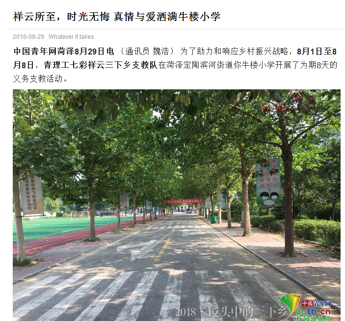 中国青年网菏泽8月29日电 (通讯员 魏浩) 为了助力和响应乡村振兴战略,8月1日至8月8日,青理工七彩祥云三下乡支教队在菏泽定陶滨河街道你牛楼小学开展了为期8天的义务支教活动。