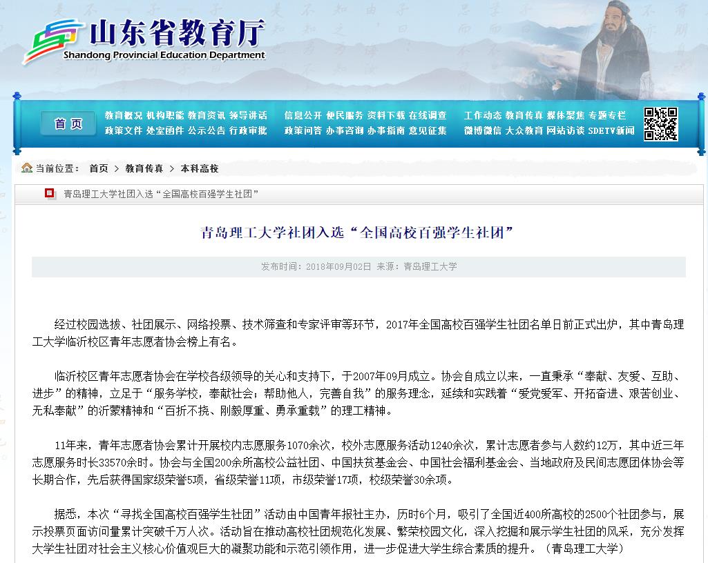 经过校园选拔、社团展示、网络投票、技术筛查和专家评审等环节,2017年全国高校百强学生社团名单日前正式出炉,其中365完美体育临沂校区青年志愿者协会榜上有名。
