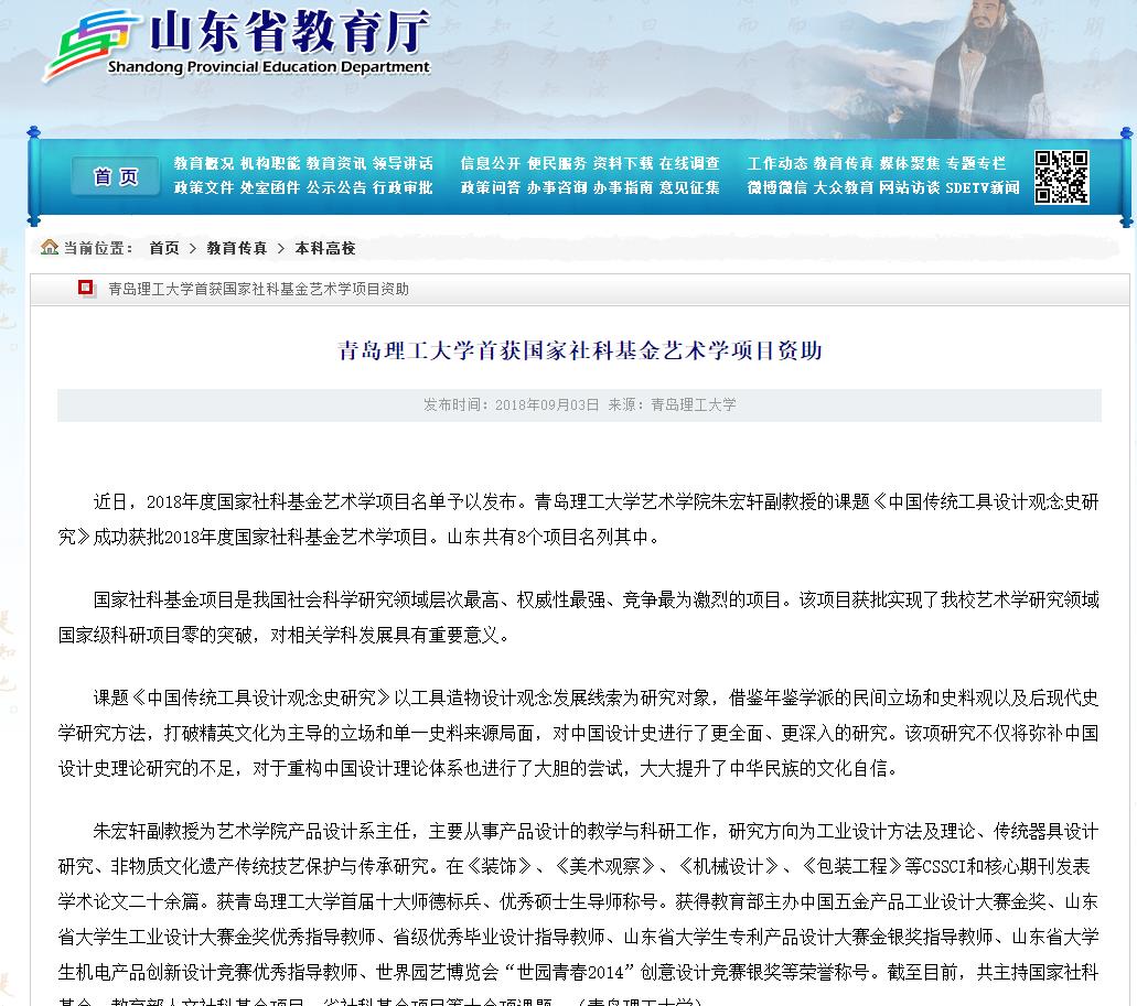 近日,2018年度国家社科基金艺术学项目名单予以发布。365完美体育艺术学院朱宏轩副教授的课题《中国传统工具设计观念史研究》成功获批2018年度国家社科基金艺术学项目。山东共有8个项目名列其中。
