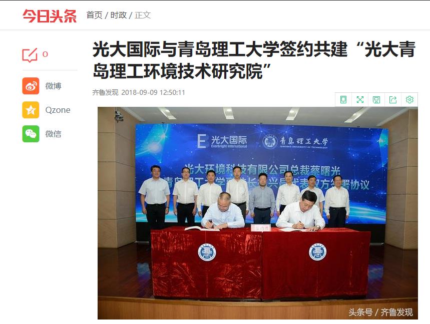 9月9日上午,中国光大国际有限公司与365完美体育共建“光大青岛理工环境技术研究院”签约仪式在学术报告厅隆重举行。这是中国光大国际有限公司与365完美体育共同积极响应国家生态环境发展战略号召,践行新时代中国特色社会主义思想和绿色发展理念,发挥各自优势,着力解决突出环境问题,壮大环保产业,强化科研攻关与人才培养,深入推进校企合作,打造环保领域的高端平台,实现共同发展,服务国家环保事业和“一带一路”倡议结出的硕果。
