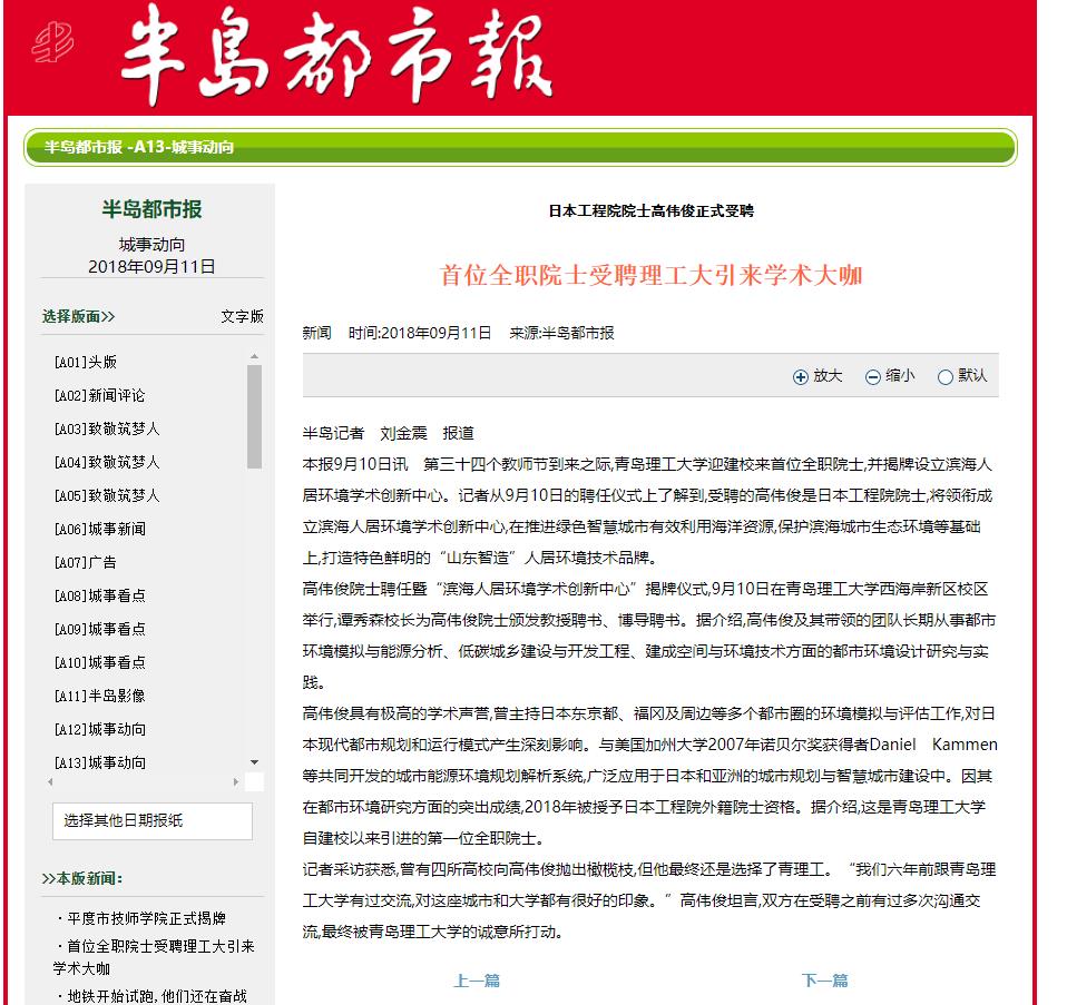 本报9月10日讯 第三十四个教师节到来之际,365完美体育迎建校来首位全职院士,并揭牌设立滨海人居环境学术创新中心。记者从9月10日的聘任仪式上了解到,受聘的高伟俊是日本工程院院士,将领衔成立滨海人居环境学术创新中心,在推进绿色智慧城市有效利用海洋资源,保护滨海城市生态环境等基础上,打造特色鲜明的“山东智造”人居环境技术品牌。
