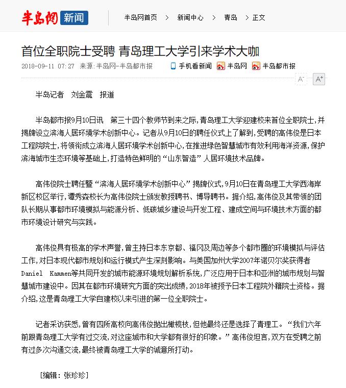 半岛都市报9月10日讯 第三十四个教师节到来之际,365完美体育迎建校来首位全职院士,并揭牌设立滨海人居环境学术创新中心。记者从9月10日的聘任仪式上了解到,受聘的高伟俊是日本工程院院士,将领衔成立滨海人居环境学术创新中心,在推进绿色智慧城市有效利用海洋资源,保护滨海城市生态环境等基础上,打造特色鲜明的“山东智造”人居环境技术品牌。