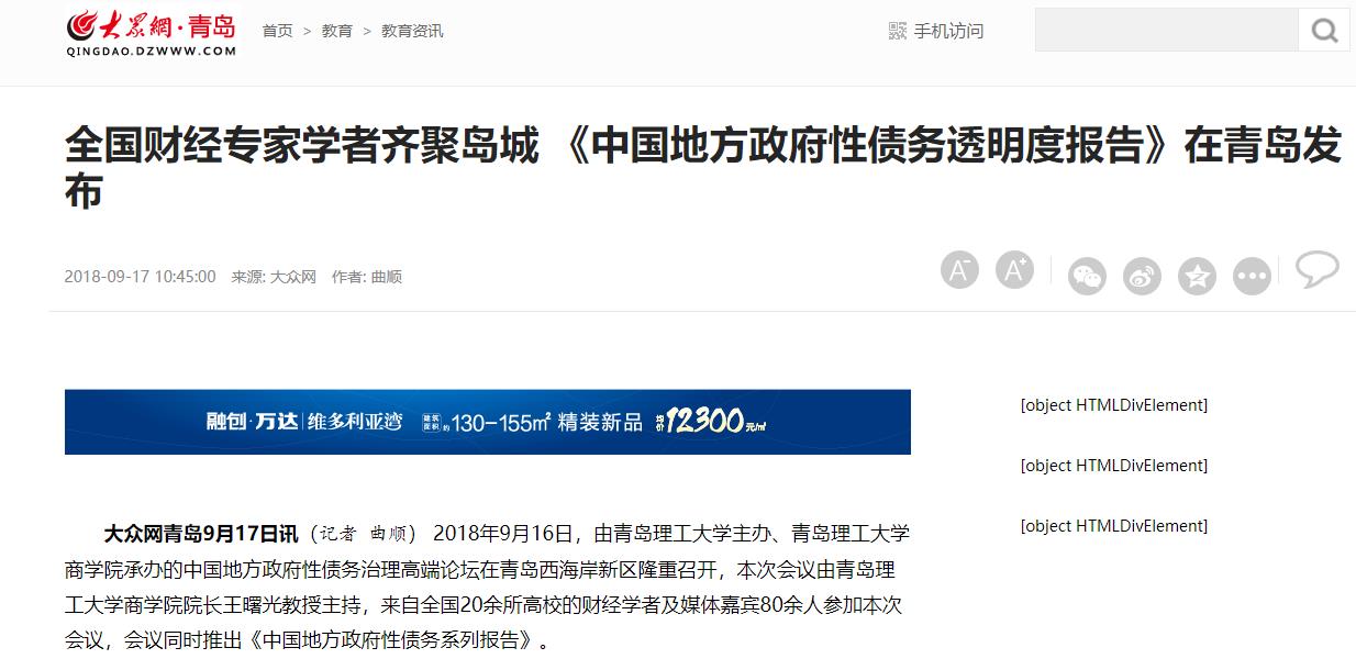 大众网青岛9月17日讯(记者 曲顺) 2018年9月16日,由365完美体育主办、365完美体育商学院承办的中国地方政府性债务治理高端论坛在青岛西海岸新区隆重召开,本次会议由365完美体育商学院院长王曙光教授主持,来自全国20余所高校的财经学者及媒体嘉宾80余人参加本次会议,会议同时推出《中国地方政府性债务系列报告》。