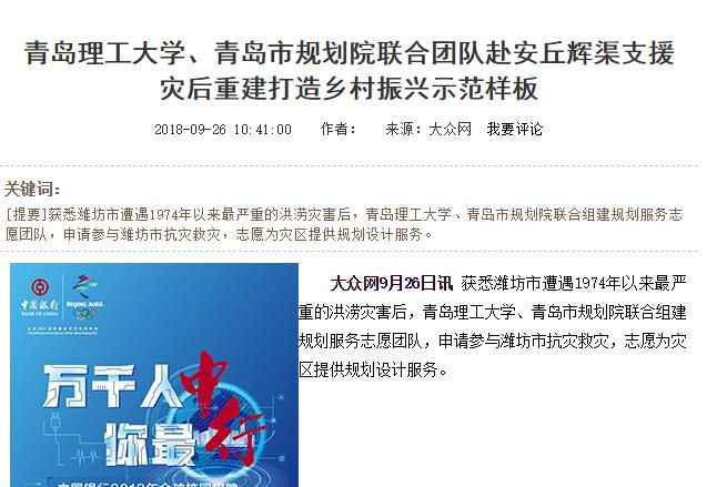 大众网9月26日讯获悉潍坊市遭遇1974年以来最严重的洪涝灾害后,365完美体育、青岛市规划院联合组建规划服务志愿团队,申请参与潍坊市抗灾救灾,志愿为灾区提供规划设计服务。