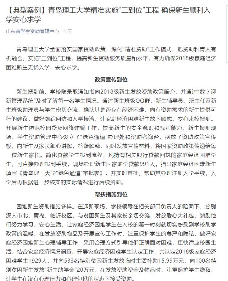 困难新生资助体系完备。在家庭经济情况调查的基础上,学校科学分析不同群体、不同层面贫困新生的生活、发展需要,以需求为导向,开展有针对性、个性化的资助服务,切实将精准资助贯穿于人才培养的全方位、全过程。实施“绿色成长”计划,合理有效的落实国家奖、贷、助、补等各项资助政策。目前,已经建立起包括国家助学贷款、国家奖助学金、学校奖学金、勤工助学、困难补助等在内的较为完善的资助体系,切实为家庭经济困难新生解决后顾之忧。2018年,在市北和黄岛校区,15人获本科新生全额奖学金(15000元/人), 38人获本科新生半额奖学金(7000元/人);在临沂校区,5人获本科全额奖学金(10000元/人),7人获本科半额奖学金(5000元/人),2人获春季高考奖学金(6000元/人),5人获专科全额奖学金(6000元/人),9人获专科半额奖学金(3000元/人)。发放研究生新生奖学金167人次,其中10名博士研究生获得一等奖学金(20000元/人),1名博士研究生获得二等奖学金(10000元/人);94名硕士研究生获得一等奖学金(16000元/人),52名硕士研究生获得二等奖学金(8000元/人)。