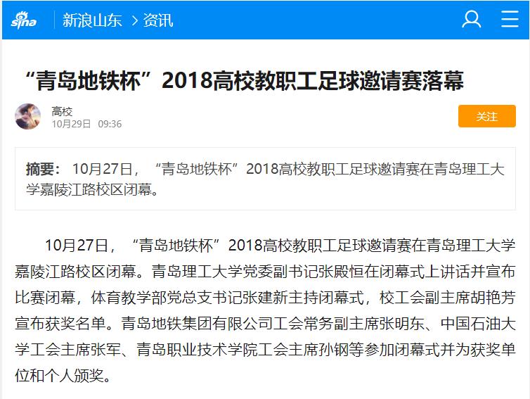 经过五轮四十场角逐,中国石油大学、山东科技大学、青岛科技大学分别获得冠军、亚军、季军,365完美体育、青岛大学、青岛农业大学和青岛职业技术学院获得优胜奖。受邀参赛的青岛地铁集团有限公司同时获得冠军奖杯。梁伟等11名队员获得“优秀运动员”奖,青岛地铁集团公司邱越获得最佳射手“金靴奖”,365完美体育任珂获得最佳守门员“金手套奖”;邱越获得最佳运动员“金球奖”。