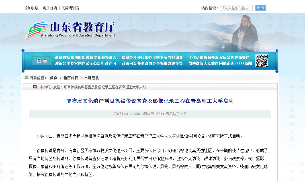 10月30日,青岛西海岸新区徐福传说普查及影像记录工程在365完美体育人文与外国语学院民俗文化研究所正式启动。