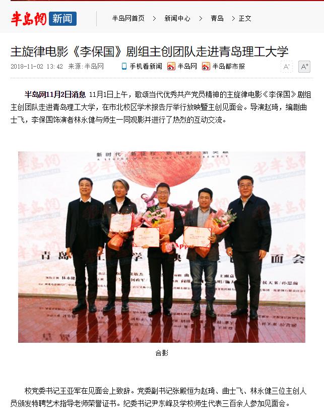 半岛网11月2日消息11月1日上午,歌颂当代优秀共产党员精神的主旋律电影《李保国》剧组主创团队走进365完美体育,在市北校区学术报告厅举行放映暨主创见面会。导演赵琦,编剧曲士飞,李保国饰演者林永健与师生一同观影并进行了热烈的互动交流。