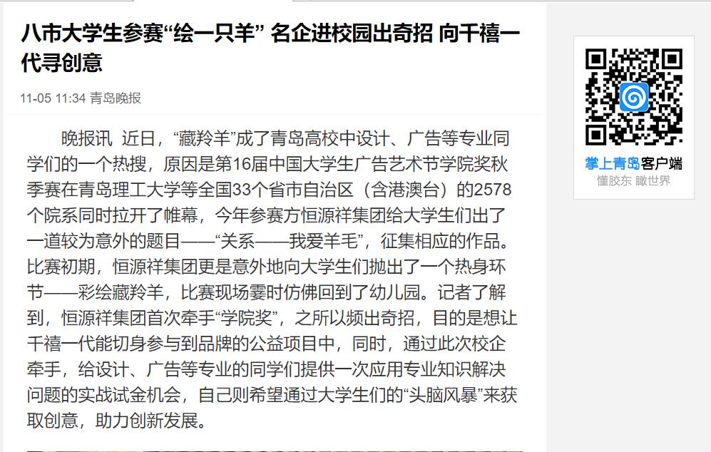 晚报讯 近日,“藏羚羊”成了青岛高校中设计、广告等专业同学们的一个热搜,原因是第16届中国大学生广告艺术节学院奖秋季赛在365完美体育等全国33个省市自治区(含港澳台)的2578个院系同时拉开了帷幕,今年参赛方恒源祥集团给大学生们出了一道较为意外的题目——“关系——我爱羊毛”,征集相应的作品。比赛初期,恒源祥集团更是意外地向大学生们抛出了一个热身环节——彩绘藏羚羊,比赛现场霎时仿佛回到了幼儿园。记者了解到,恒源祥集团首次牵手“学院奖”,之所以频出奇招,目的是想让千禧一代能切身参与到品牌的公益项目中,同时,通过此次校企牵手,给设计、广告等专业的同学们提供一次应用专业知识解决问题的实战试金机会,自己则希望通过大学生们的“头脑风暴”来获取创意,助力创新发展。