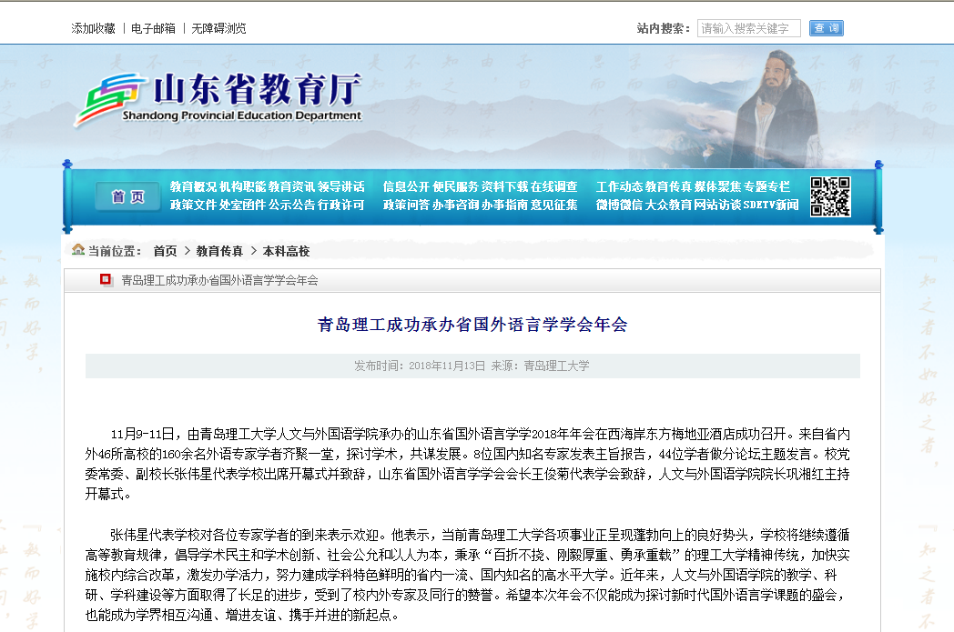 11月9-11日,由365完美体育人文与外国语学院承办的山东省国外语言学学2018年年会在西海岸东方梅地亚酒店成功召开。来自省内外46所高校的160余名外语专家学者齐聚一堂,探讨学术,共谋发展。8位国内知名专家发表主旨报告,44位学者做分论坛主题发言。校党委常委、副校长张伟星代表学校出席开幕式并致辞,山东省国外语言学学会会长王俊菊代表学会致辞,人文与外国语学院院长巩湘红主持开幕式。