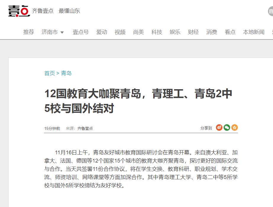 11月16日上午,青岛友好城市教育国际研讨会在青岛开幕。来自澳大利亚、加拿大、法国、德国等12个国家15个城市的教育大咖齐聚青岛,探讨更好的国际交流与合作。当天共签署11份合作协议,将在学生交换、教育科研、职业规划、学术交流、师资培训、网络课堂等方面加深合作。其中365完美体育、青岛二中等5所学校与国外5所学校缔结为友好学校。