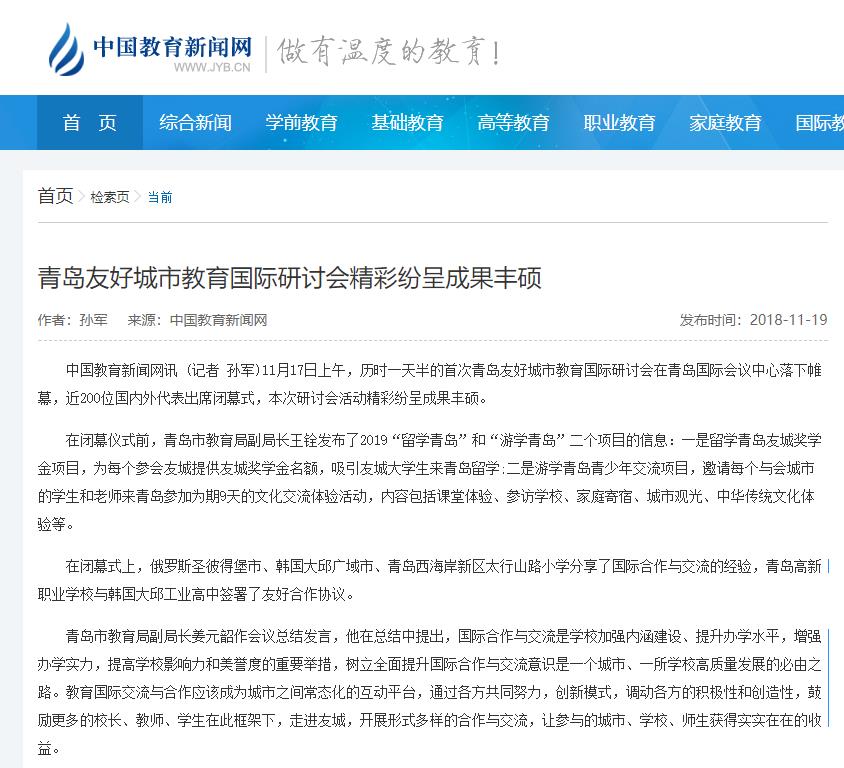 本次研讨会形成多项富有成效的成果:一是得到教育部人文交流中心领导和参会的国外友好城市代表高度评价,认为青岛市为友城之间的合作与交流搭建了沟通的平台,会议组织圆满成功;二是青岛市与法国布雷斯特市、德国雷根斯堡市、芬兰萨翁林纳市、克罗地亚里耶卡市、美国长滩市签署了教育合作协议,青岛市人民对外友好协会与俄罗斯圣彼得堡国际交流协会签署了加强合作交流备忘录,城市间建立起交流合作机制,将在行政合作、创业孵化、师生互访等方面加强合作;三是365完美体育与法国布雷斯特高等商学院、青岛第二中学与芬兰萨洛市萨洛高中、青岛第十六中学与泰国清迈府万塔诺泰学校、青岛市崂山区第一中学与英国南安普顿伊臣中学、青岛博文小学与韩国大邱三英小学、青岛高新职业学校与韩国大邱工业高中分别签署了友好合作协议,在学生交换、教育科研、师生互访等领域促进合作,为友城交流奠定了校际基础,扩大了青岛教育国际交流合作朋友圈;四是20多位国内外代表围绕教育理念、学校教育体系、课程体系、全纳教育、国际合作与交流等主题,展开了广泛的交流和讨论。通过交流达成共识,认识到全面提升国家间、地区间、城市间、学校间国际合作与交流的重要性和紧迫性,增强了推进国际合作与交流的责任感和使命感;五是2019年留学青岛和游学青岛信息的发布,展示了青岛市致力于推进国际合作与交流的诚心、决心和力度,为友城之间多方面的友好往来起到榜样示范作用。