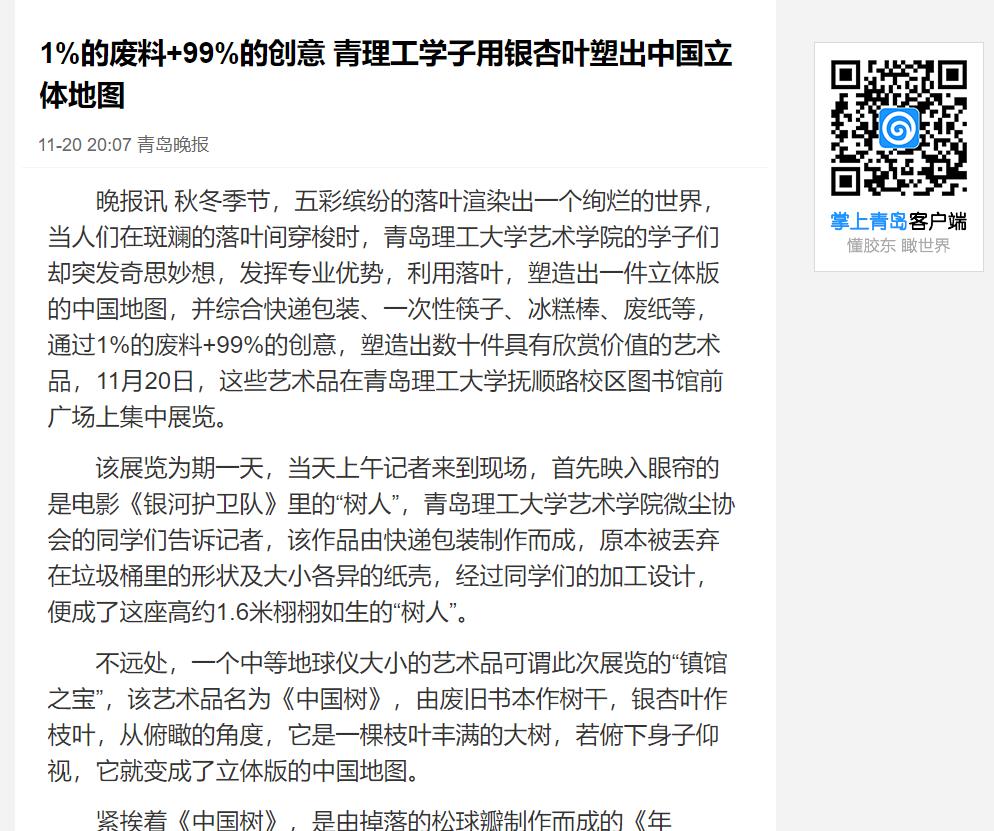 记者了解到,这些作品大都由大一的同学制作完成,其目的是通过知识的运用,培养并提升专业能力,同时培养同学们的环保意识,节约现有资源,提高利用效益。(青岛晚报/掌上青岛/青网 记者 杨海涛)