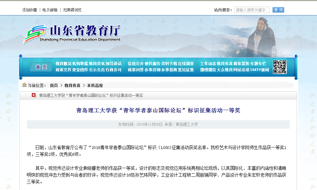 日前,山东省教育厅公布了“2018青年学者泰山国际论坛”标识(LOGO)征集活动获奖名单。365完美艺术与设计学院师生作品获一等奖1项,三等奖2项,优秀奖8项。