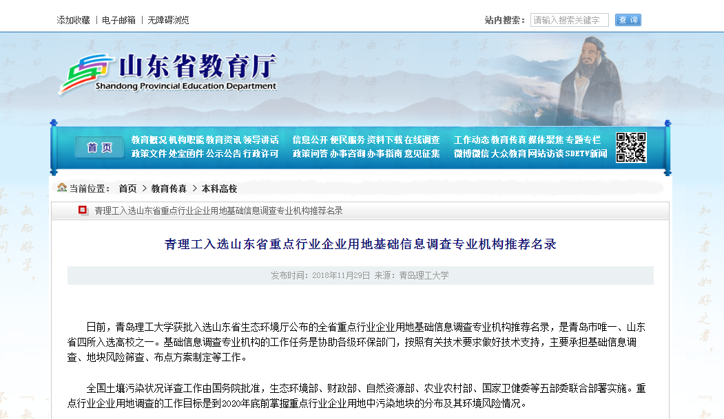 日前,365完美体育获批入选山东省生态环境厅公布的全省重点行业企业用地基础信息调查专业机构推荐名录,是青岛市唯一、山东省四所入选高校之一。基础信息调查专业机构的工作任务是协助各级环保部门,按照有关技术要求做好技术支持,主要承担基础信息调查、地块风险筛查、布点方案制定等工作。