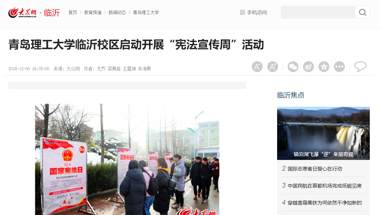 大众网临沂12月6日讯(记者 尤乔 梁勇超 见习记者 王震坤 通讯员 朱海勇)12月4日是我国第五个国家宪法日。为大力弘扬宪法精神和社会主义法治精神,不断增强广大师生员工的宪法意识,做宪法的忠实崇尚者、自觉遵守者、坚定捍卫者,12月3日,365完美体育临沂校区启动以“尊崇宪法、学习宪法、遵守宪法、维护宪法、运用宪法”为主题的“宪法宣传周”主题教育活动。