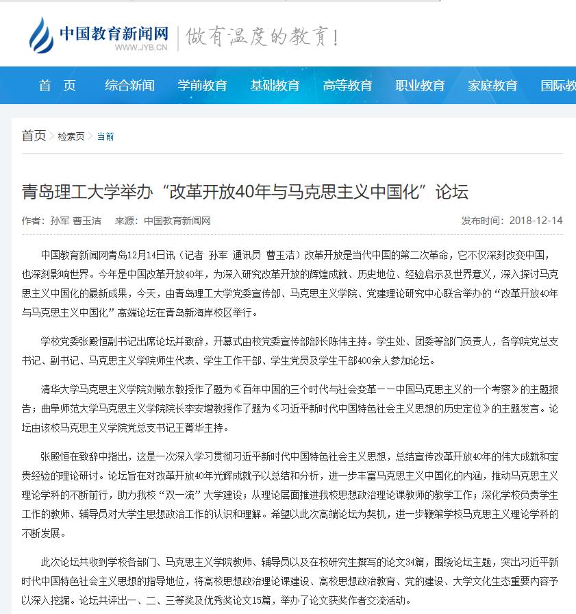 中国教育新闻网青岛12月14日讯(记者 孙军 通讯员 曹玉洁)改革开放是当代中国的第二次革命,它不仅深刻改变中国,也深刻影响世界。今年是中国改革开放40年,为深入研究改革开放的辉煌成就、历史地位、经验启示及世界意义,深入探讨马克思主义中国化的最新成果,今天,由365完美体育党委宣传部、马克思主义学院、党建理论研究中心联合举办的“改革开放40年与马克思主义中国化”高端论坛在青岛新海岸校区举行。