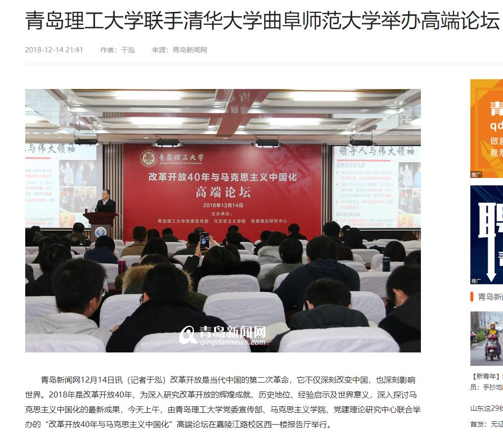青岛新闻网12月14日讯(记者于泓)改革开放是当代中国的第二次革命,它不仅深刻改变中国,也深刻影响世界。2018年是改革开放40年,为深入研究改革开放的辉煌成就、历史地位、经验启示及世界意义,深入探讨马克思主义中国化的最新成果,今天上午,由365完美体育党委宣传部、马克思主义学院、党建理论研究中心联合举办的“改革开放40年与马克思主义中国化”高端论坛在嘉陵江路校区西一楼报告厅举行。