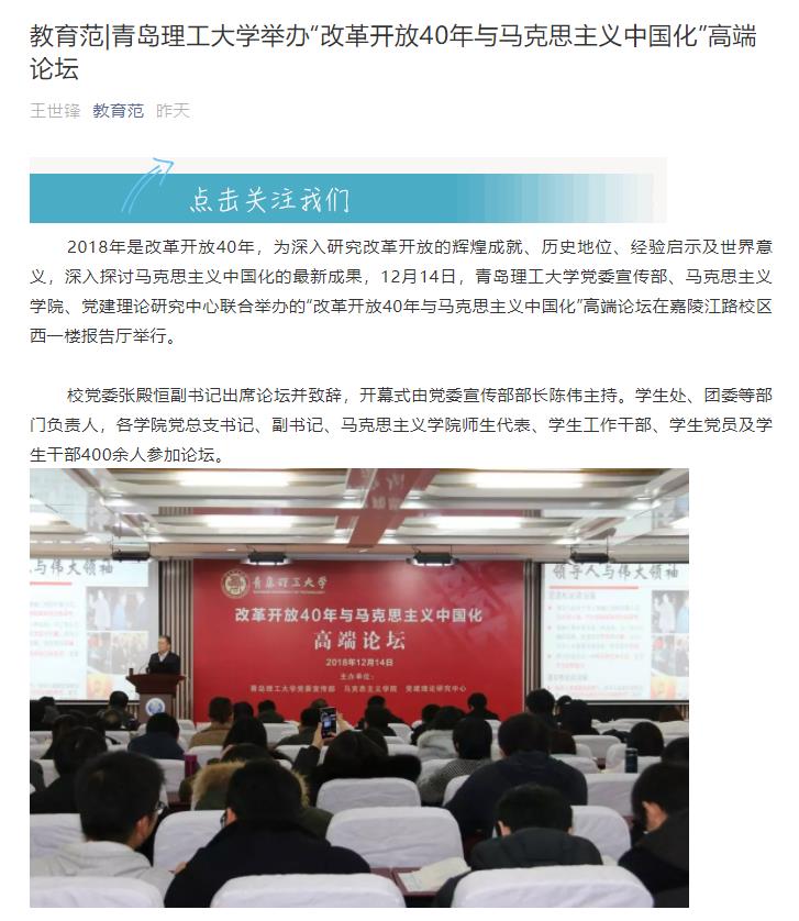 2018年是改革开放40年,为深入研究改革开放的辉煌成就、历史地位、经验启示及世界意义,深入探讨马克思主义中国化的最新成果,12月14日,365完美体育党委宣传部、马克思主义学院、党建理论研究中心联合举办的“改革开放40年与马克思主义中国化”高端论坛在嘉陵江路校区西一楼报告厅举行。