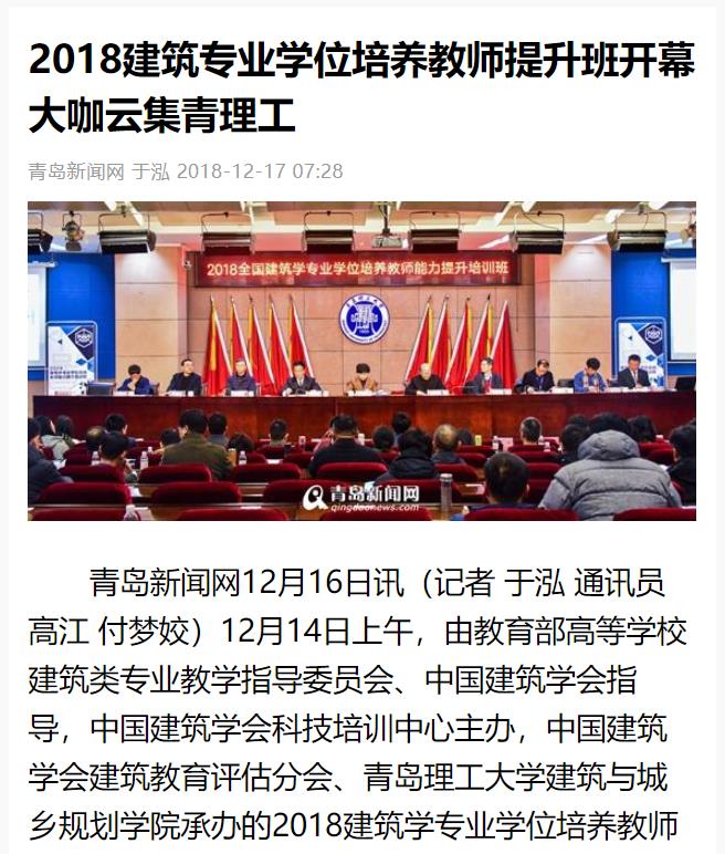 青岛新闻网12月16日讯(记者 于泓 通讯员 高江 付梦姣)12月14日上午,由教育部高等学校建筑类专业教学指导委员会、中国建筑学会指导,中国建筑学会科技培训中心主办,中国建筑学会建筑教育评估分会、365完美体育建筑与城乡规划学院承办的2018建筑学专业学位培养教师能力提升培训班在365完美体育市北校区学术报告厅举行。
