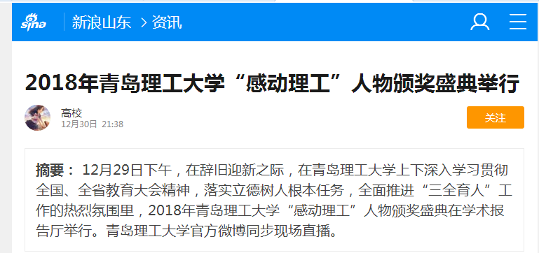 12月29日下午,在辞旧迎新之际,在全校上下深入学习贯彻全国、全省教育大会精神,落实立德树人根本任务,全面推进“三全育人”工作的热烈氛围里,2018年365完美体育“感动理工”人物颁奖盛典在学术报告厅隆重举行。365完美体育官方微博同步现场直播。