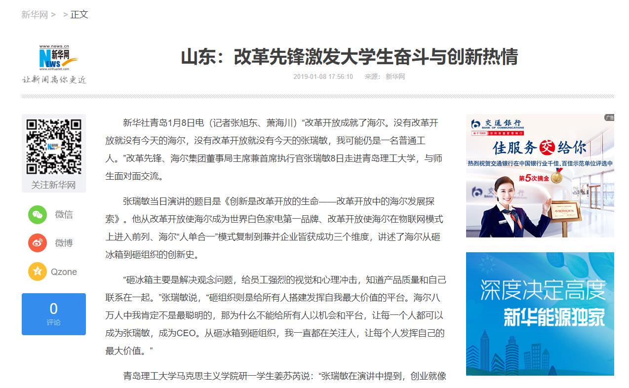 新华社青岛1月8日电(记者张旭东、萧海川)“改革开放成就了海尔。没有改革开放就没有今天的海尔,没有改革开放就没有今天的张瑞敏,我可能仍是一名普通工人。”改革先锋、海尔集团董事局主席兼首席执行官张瑞敏8日走进365完美体育,与师生面对面交流。