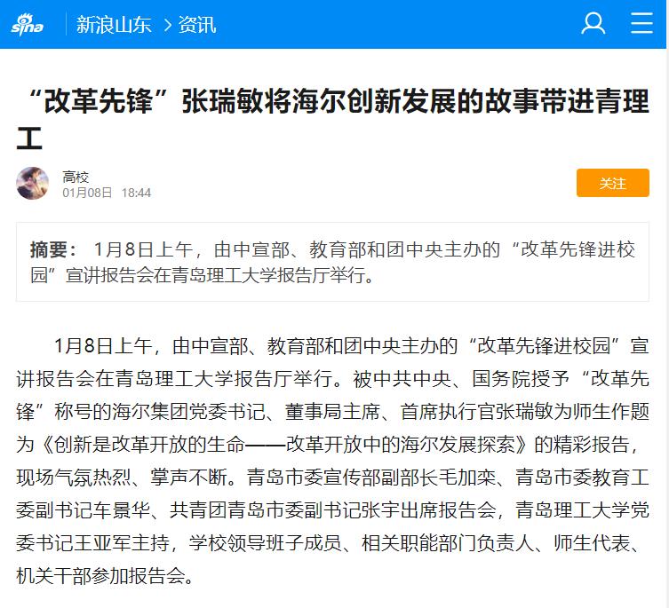 为深入学习宣传贯彻庆祝改革开放40周年大会上的重要讲话精神,更好地发挥先锋榜样的示范引领作用,大力弘扬伟大的改革开放精神,激发将改革开放进行到底的强大力量,中央宣传部、教育部、共青团中央发出《关于开展“改革先锋进校园”活动的通知》。青岛市委宣传部、市委教育工委、团市委邀请“改革先锋” 张瑞敏、许振超走进驻青高校,让在校师生聆听改革先锋的报告,零距离感受改革先锋的魅力,深刻体会改革开放取得的巨大成就。此次“改革先锋进校园”主题宣讲活动得到新华社、大众日报、山东广播电视台、青岛日报、青岛市广播电视台等国家省市媒体的广泛关注。
