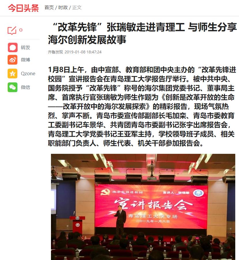 为深入学习宣传贯彻在庆祝改革开放40周年大会上的重要讲话精神,更好地发挥先锋榜样的示范引领作用,大力弘扬伟大的改革开放精神,激发将改革开放进行到底的强大力量,中央宣传部、教育部、共青团中央发出《关于开展“改革先锋进校园”活动的通知》。青岛市委宣传部、市委教育工委、团市委邀请“改革先锋” 张瑞敏、许振超走进驻青高校,让在校师生聆听改革先锋的报告,零距离感受改革先锋的魅力,深刻体会改革开放取得的巨大成就。此次“改革先锋进校园”主题宣讲活动得到新华社、大众日报、山东广播电视台、青岛日报、青岛市广播电视台等国家省市媒体的广泛关注。