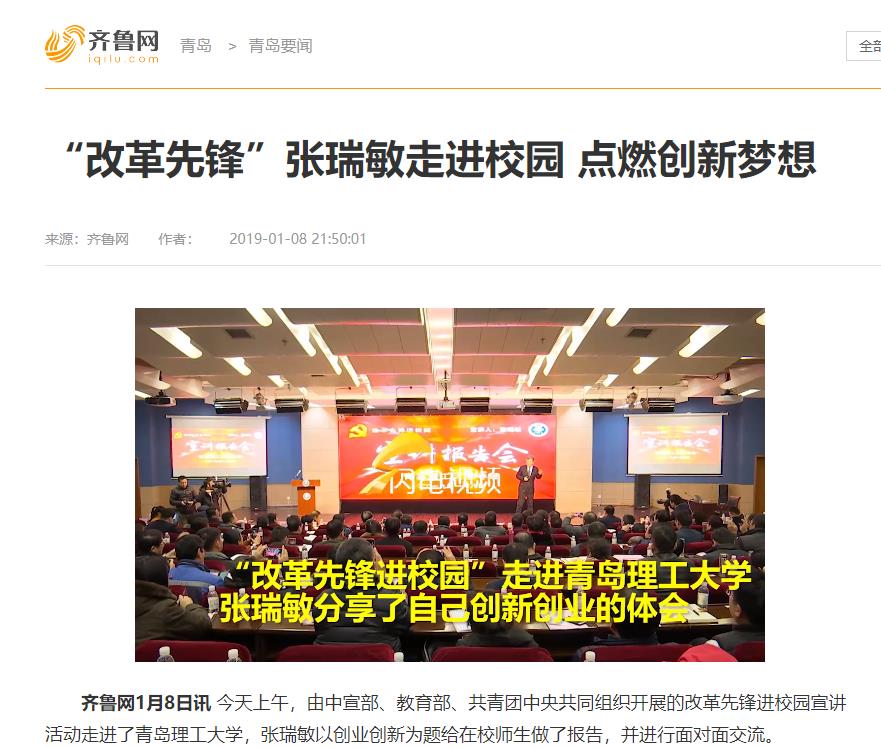 齐鲁网1月8日讯今天上午,由中宣部、教育部、共青团中央共同组织开展的改革先锋进校园宣讲活动走进了365完美体育,张瑞敏以创业创新为题给在校师生做了报告,并进行面对面交流。
