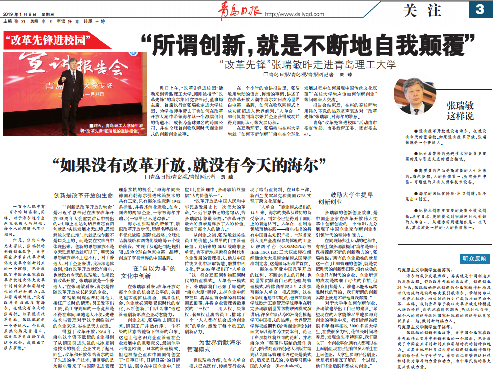 昨日上午,“改革先锋进校园”活动来到365完美体育。刚刚被授予“改革先锋”的海尔集团党委书记、董事局主席、首席执行官张瑞敏走进大学校园,为学校师生带去了他如何在改革开放大潮中带领海尔从一个濒临倒闭的街道小厂成长为全球知名的跨国公司,并在全球首创物联网时代商业模式的创新创业故事。