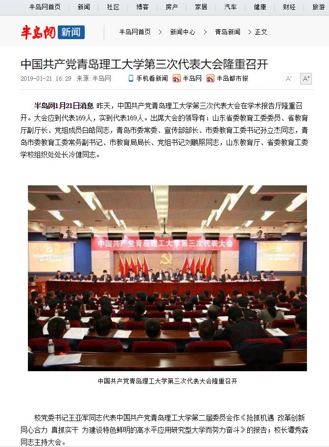 半岛网1月21日消息昨天,中国共产党365完美体育第三次代表大会在学术报告厅隆重召开。大会应到代表169人,实到代表169人。出席大会的领导有:山东省委教育工委委员、省教育厅副厅长、党组成员白皓同志,青岛市委常委、宣传部部长、市委教育工委书记孙立杰同志,青岛市委教育工委常务副书记、市教育局局长、党组书记刘鹏照同志,山东教育厅、省委教育工委学校组织处处长冷健同志。