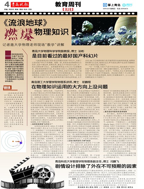一部《流浪地球》,为国产科幻电影拼出了希望,甚至被称为中国科幻电影元年真正到来的标志。该片主要涉及哪些重要的物理知识点?撇开娱乐性,地球“流浪”的方案在科学的维度靠不靠谱?尤其是地球和木星碰撞危机的解除方式,是否符合科学逻辑?记者就此采访了驻青高校的几位物理学科教师。