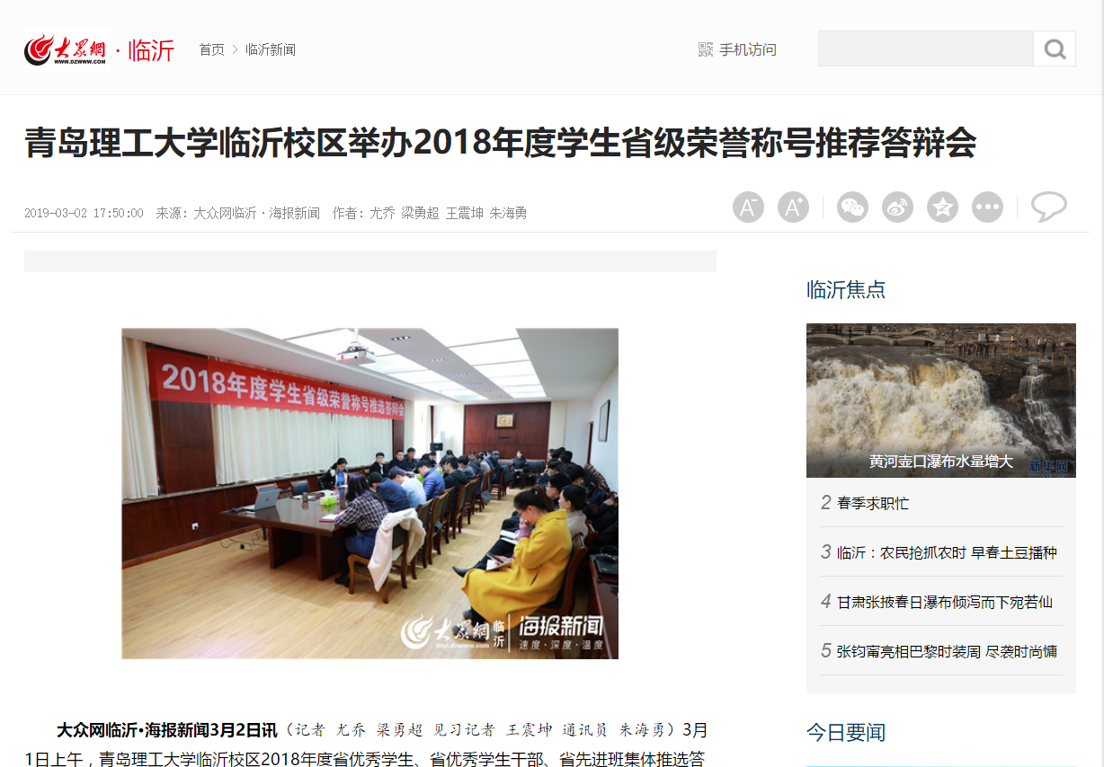 大众网临沂·海报新闻3月2日讯(记者 尤乔 梁勇超 见习记者 王震坤 通讯员 朱海勇)3月1日上午,365完美体育临沂校区2018年度省优秀学生、省优秀学生干部、省先进班集体推选答辩会在办公楼202室举行。校区党委常务副书记李国涛,学生工作部副主任、团委书记刘宗庆出席答辩会,校区学生工作部、教务部、基础部、体育教学部、各系辅导员等相关教师及学生代表担任评委。