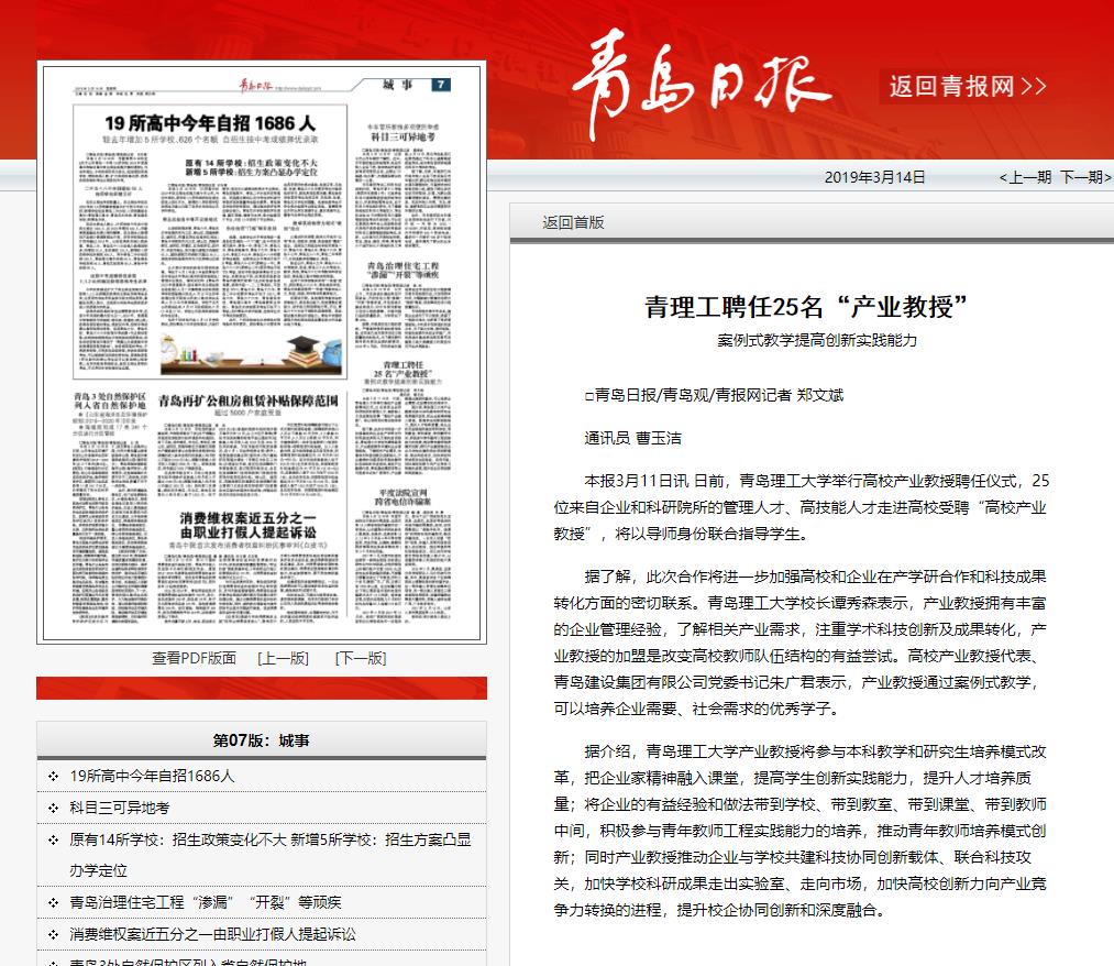 据了解,此次合作将进一步加强高校和企业在产学研合作和科技成果转化方面的密切联系。365完美体育校长谭秀森表示,产业教授拥有丰富的企业管理经验,了解相关产业需求,注重学术科技创新及成果转化,产业教授的加盟是改变高校教师队伍结构的有益尝试。高校产业教授代表、青岛建设集团有限公司党委书记朱广君表示,产业教授通过案例式教学,可以培养企业需要、社会需求的优秀学子。
