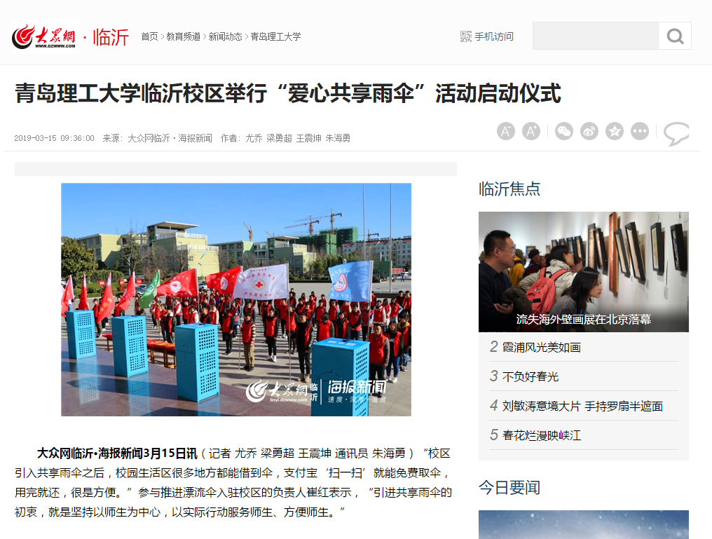 大众网临沂·海报新闻3月15日讯(记者 尤乔 梁勇超 王震坤 通讯员朱海勇)“校区引入共享雨伞之后,校园生活区很多地方都能借到伞,支付宝‘扫一扫’就能免费取伞,用完就还,很是方便。”参与推进漂流伞入驻校区的负责人崔红表示,“引进共享雨伞的初衷,就是坚持以师生为中心,以实际行动服务师生、方便师生。”