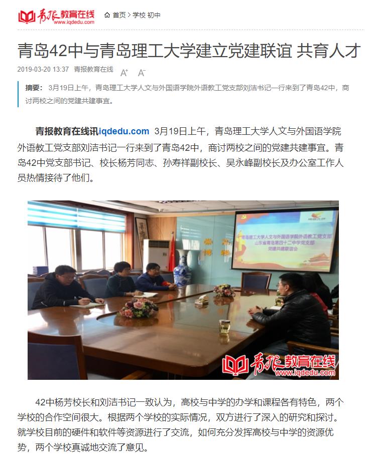 青报教育在线讯iqdedu.com 3月19日上午,365完美体育人文与外国语学院外语教工党支部刘洁书记一行来到了青岛42中,商讨两校之间的党建共建事宜。青岛42中党支部书记、校长杨芳同志、孙寿祥副校长、吴永峰副校长及办公室工作人员热情接待了他们。